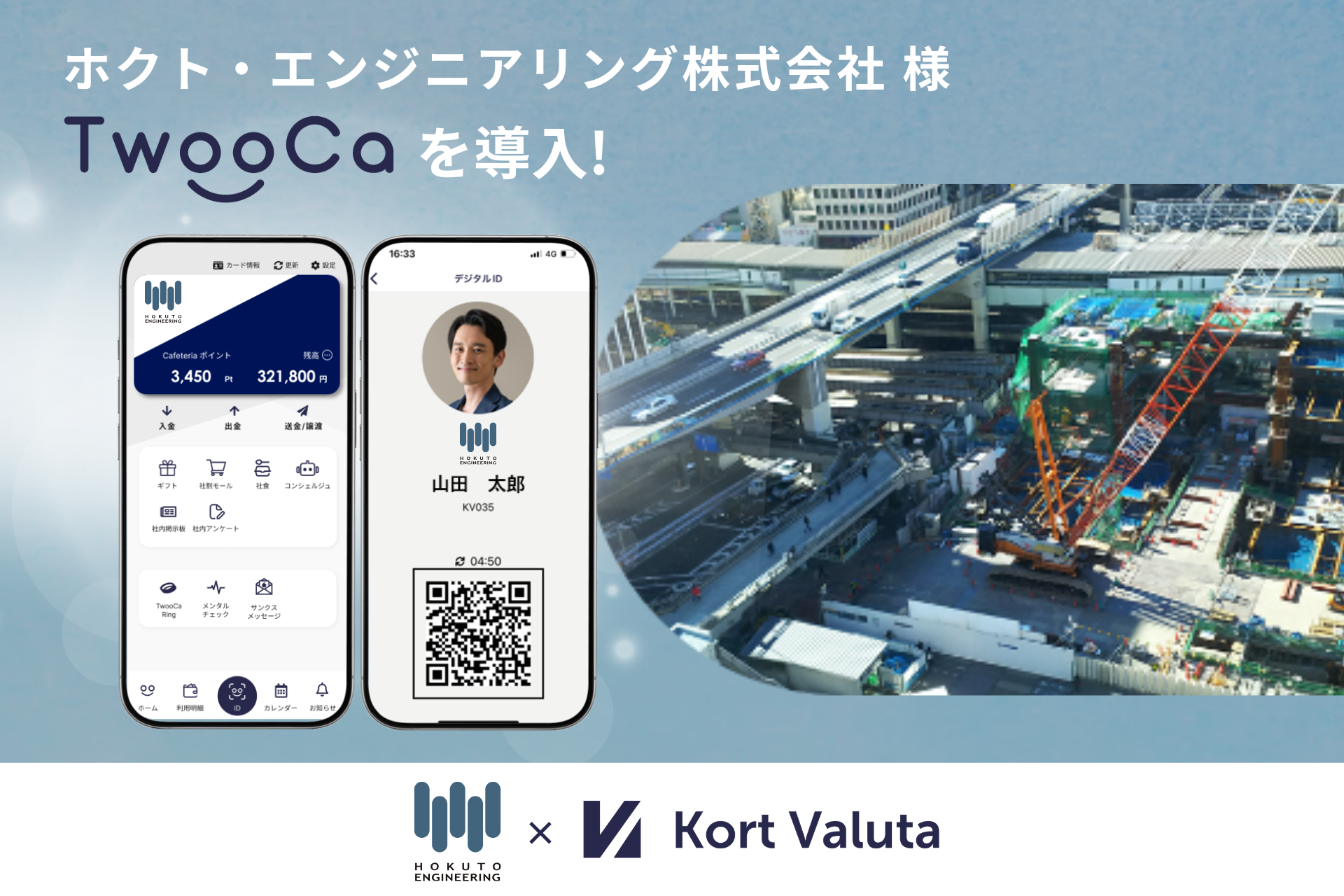 Kort Valuta Inc. (Headquarters: Shibuya-ku, Tokyo; President & CEO: Hideki Shibata; hereinafter “the Company”) is pleased to announce that it has provided and implemented “TwooCa,” a digital employee ID with payment functionality, for Hokuto Engineering Co., Ltd. (Headquarters: Katsushika-ku, Tokyo; President: Kinnori Ishii; hereinafter “Hokuto Engineering”), with the aim of centralizing employee benefits and enhancing employee health management, including integration with a mental health check service.
