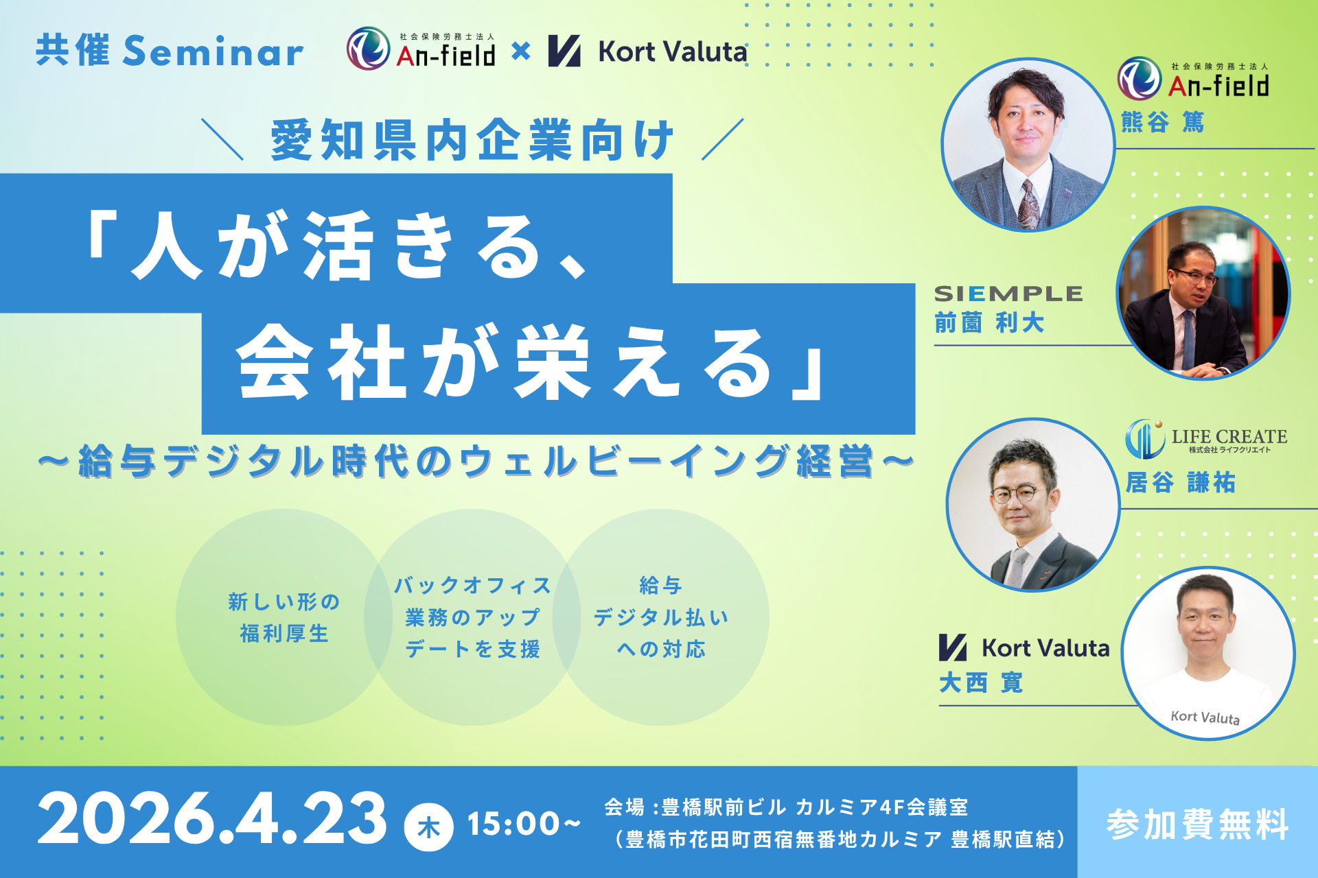 株式会社Kort Valuta(本社:東京都渋谷区、代表取締役 柴田秀樹、以下「当社」)は、社会保険労務士法人An-field(所在地:愛知県豊川市、代表社員:熊谷篤、以下「An-field」)と共同で、2026年4月23日(木)に愛知県内の事業会社向けセミナー「人が活きる、会社が栄える ~給与デジタル時代のウェルビーイング経営~」を開催いたします。